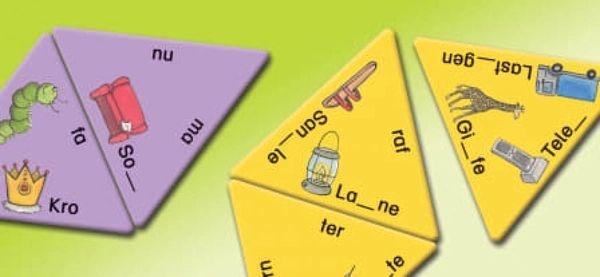 Spiel 1 Zweisilbige Wörter: Die fehlende Silbe in einem Wort aus zwei Silben finden. Anfangssilbe jeweils mit Bild,