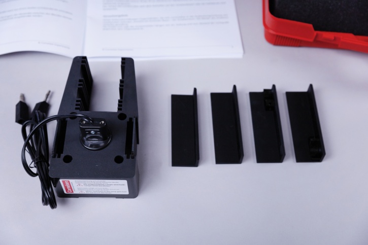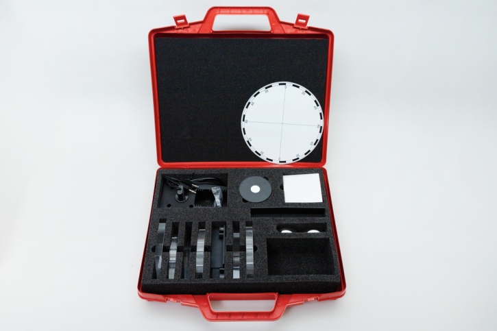 Im Transport- und Aufbewahrungskoffer (440 x 330 x 100 mm) mit Schaumstoff-Formeinsatz.